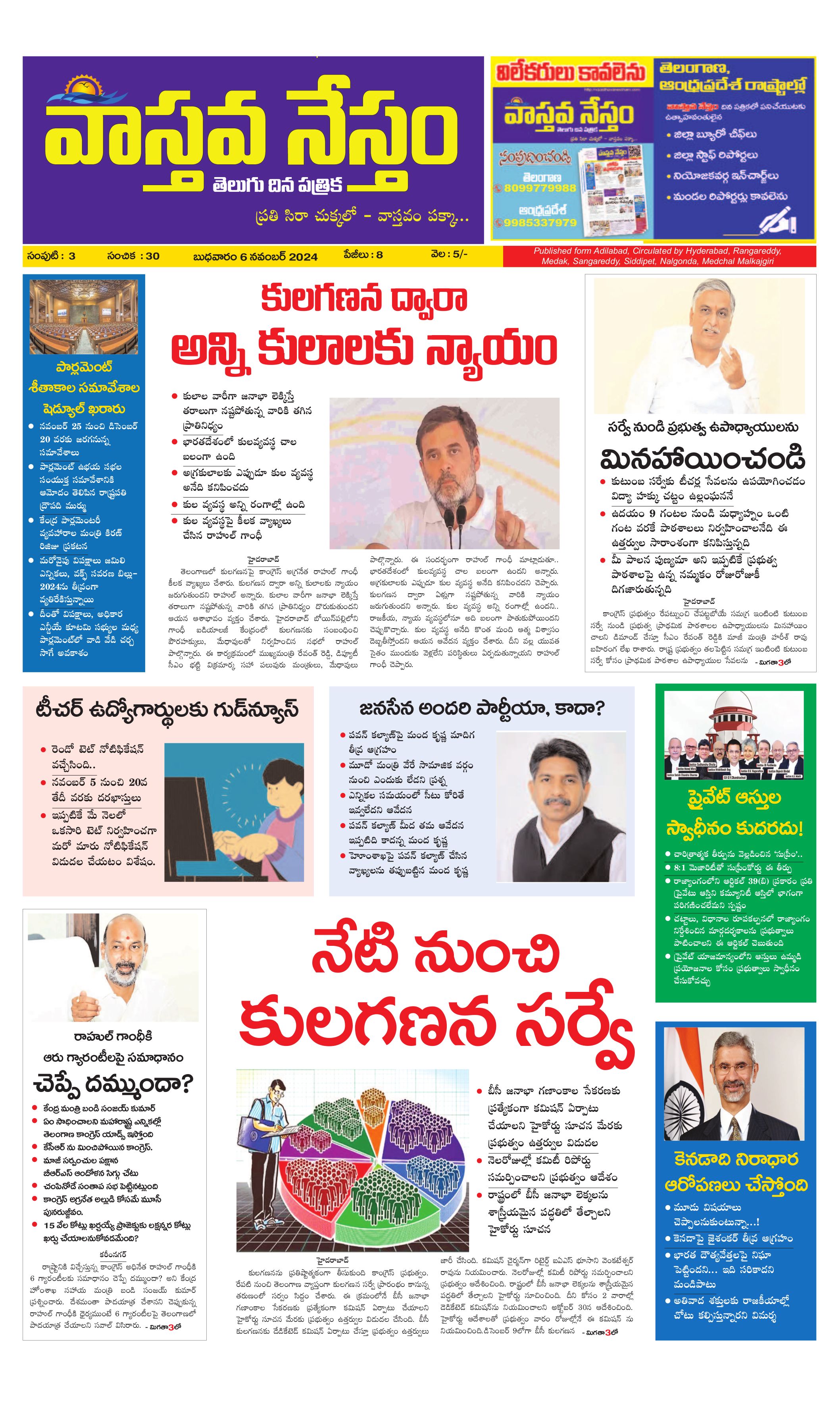 Vaasthava Nestham Telugu News Paper - 06 Nov 2024 - Page 1