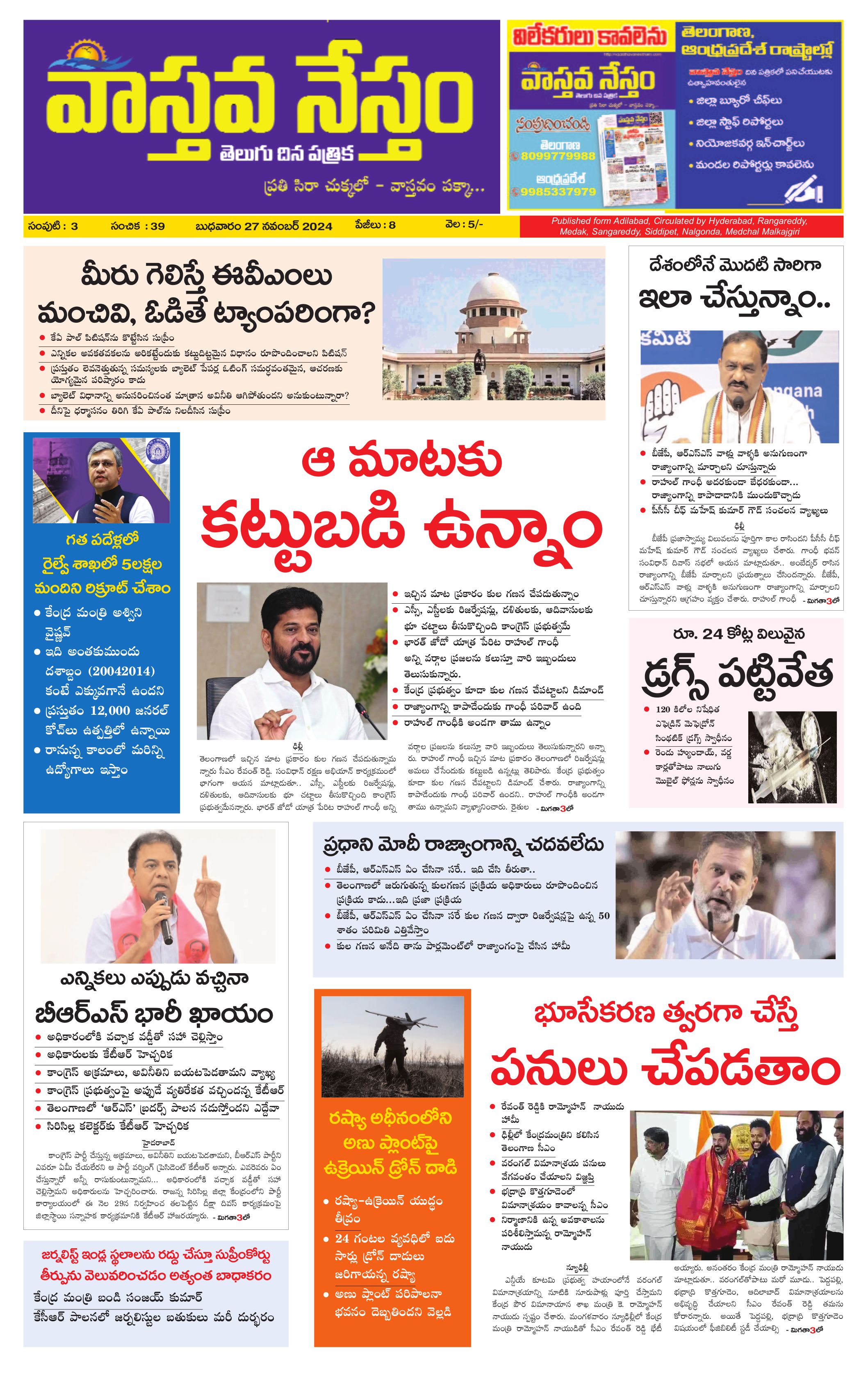 Vaasthava Nestham Telugu News Paper - 27 Nov 2024 - Page 1