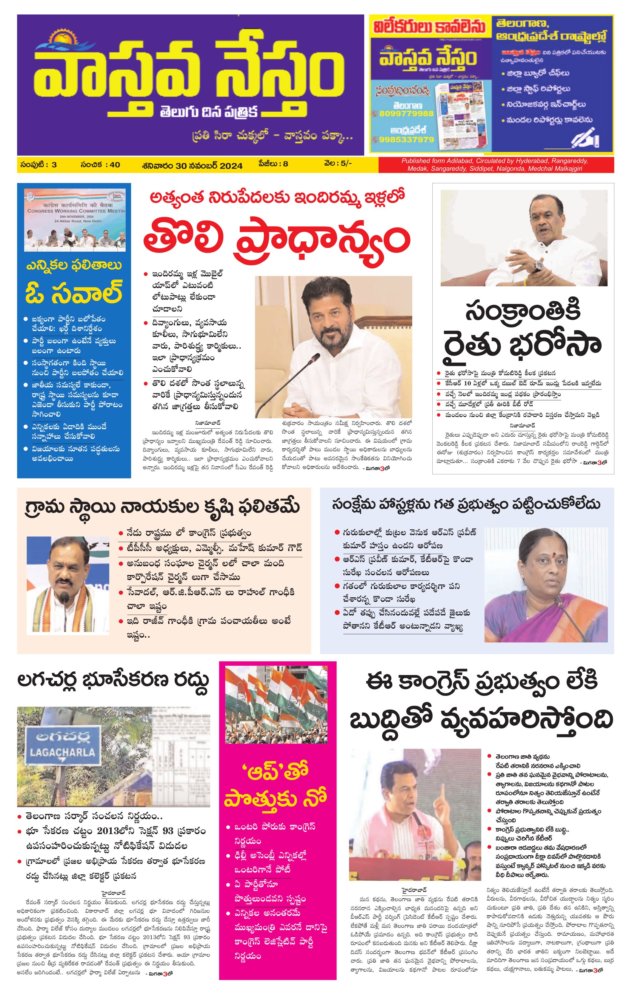 Vaasthava Nestham Telugu News Paper - 30 Nov 2024 - Page 1