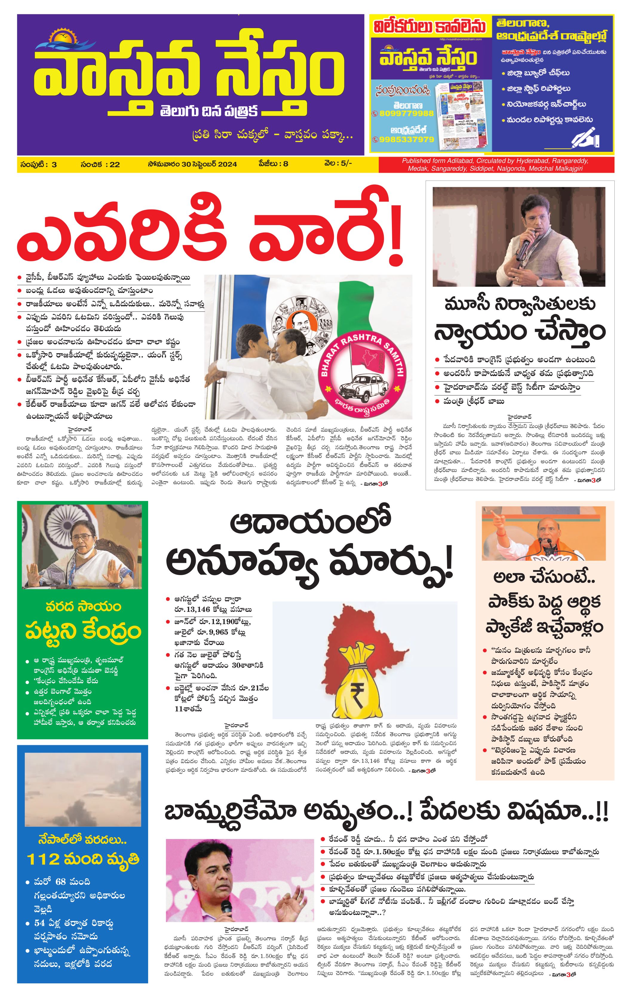 Vaasthava Nestham Telugu News Paper - 30 Sep 2024 - Page 1